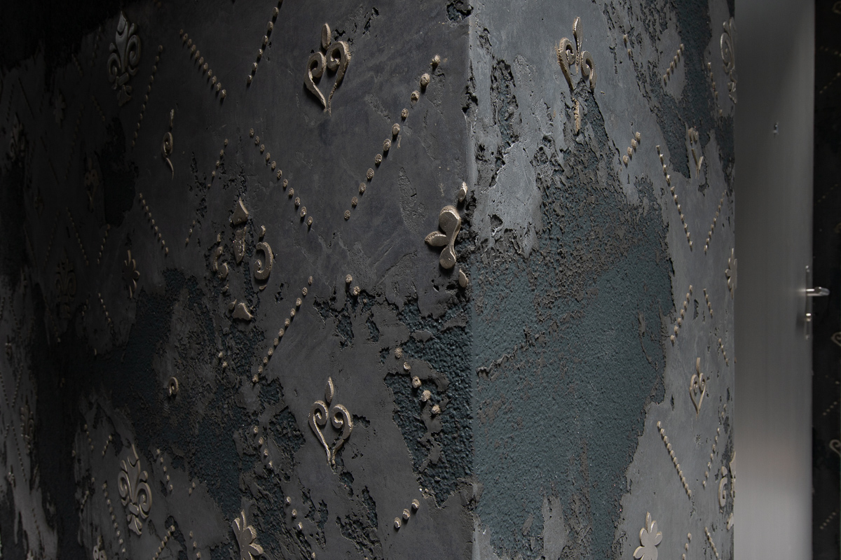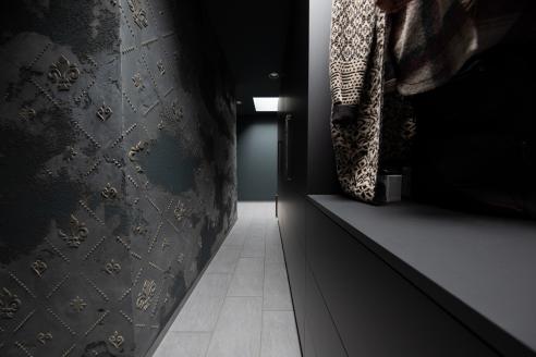 Das bestehende, kühl wirkende Treppenhaus soll nun im Mittelpunkt stehen, wobei der Kubus in edler Antikverputztechnik von dunklen Farbtönen umhüllt, wirkungsvoll in Szene gesetzt wird. Abgerundet wird das Konzept durch kontrastreiche Türen und Zargen in gebürsteter Platinoptik.