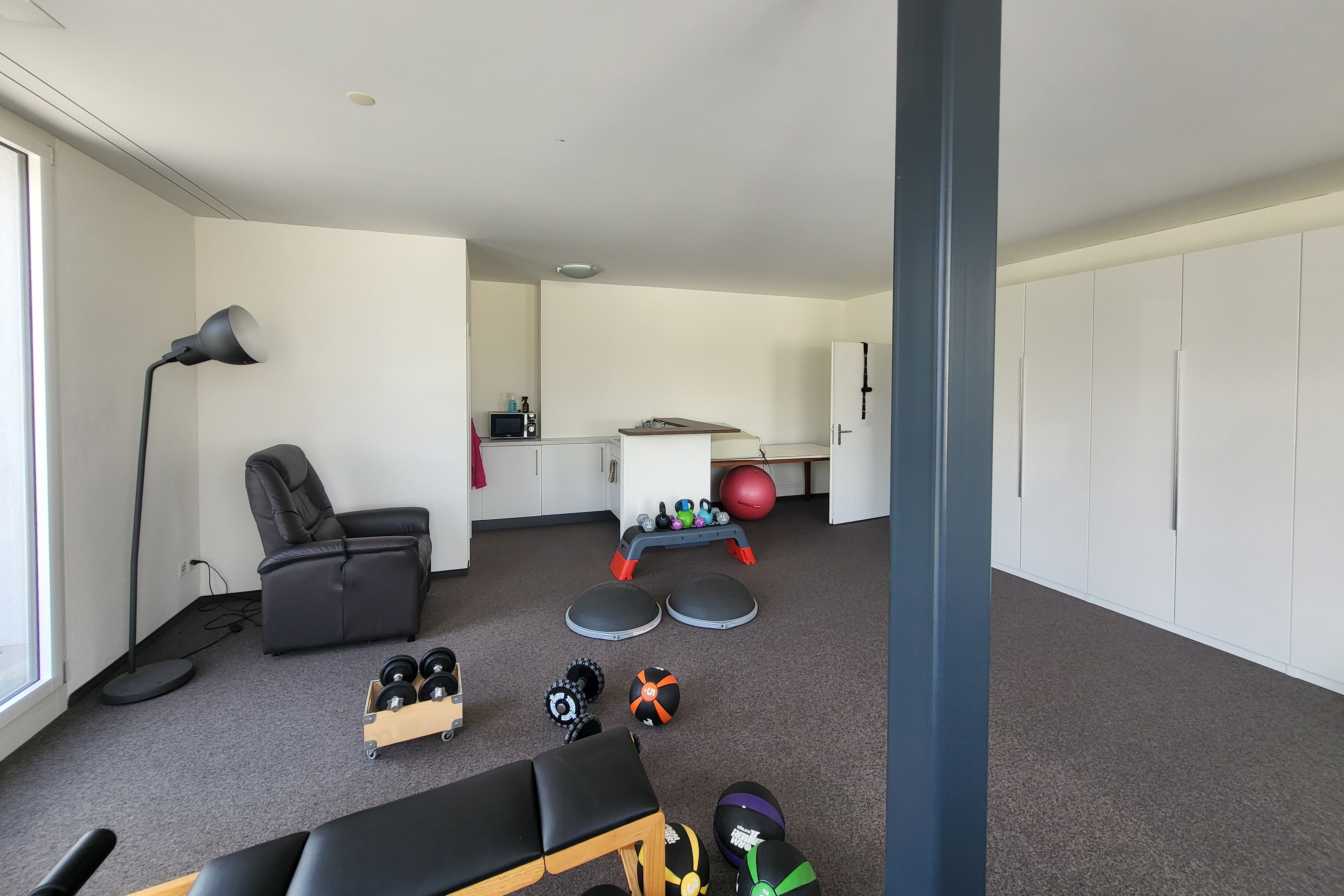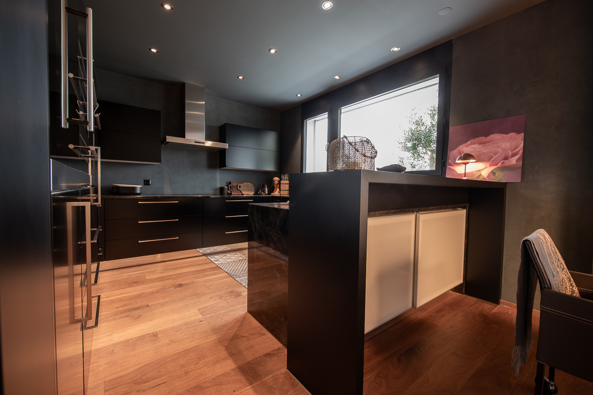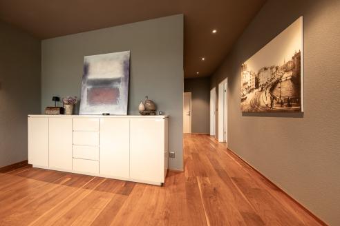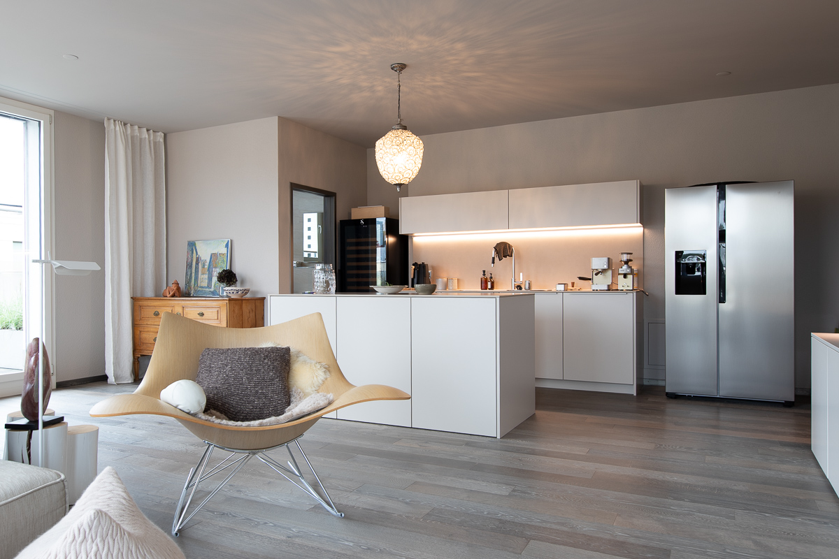 Im Mehrzweckraum entstand ein grosszügiger, multifunktionaler Wohnraum, den wir in hellen Farbtönen gestaltet haben – abgestimmt auf das neu verlegte Parkett von Markus Schweizer sowie die neu erstellte Küche von Sibylle Frei. Ebenso wurden die Sockelleisten mittels traditioneller Handwerkstechnik des Maserierens farblich in Platinoptik angepasst. Abgerundet wird das Gesamtbild durch farblich abgestimmte, lackierte Elektroabdeckungen.
