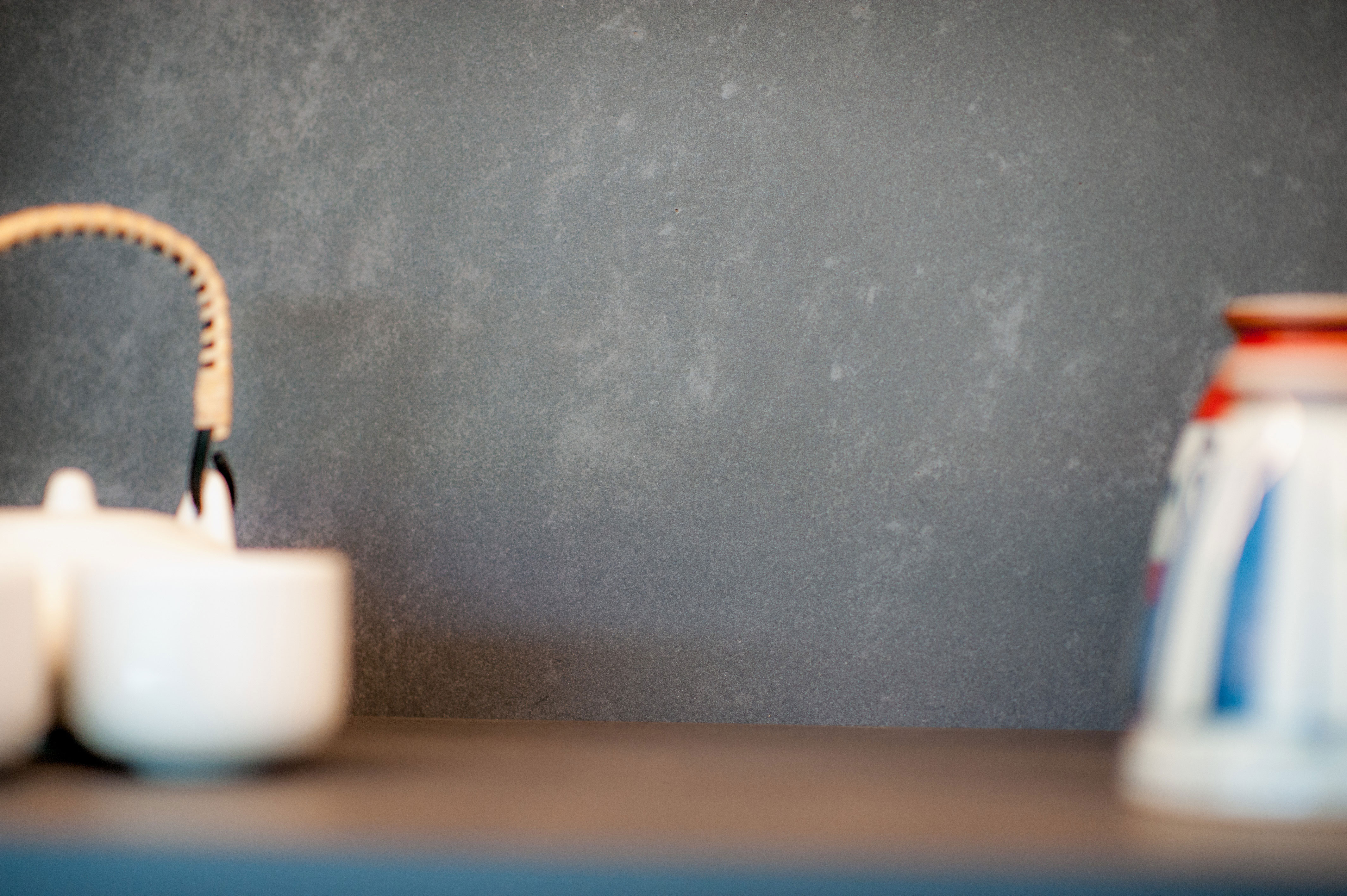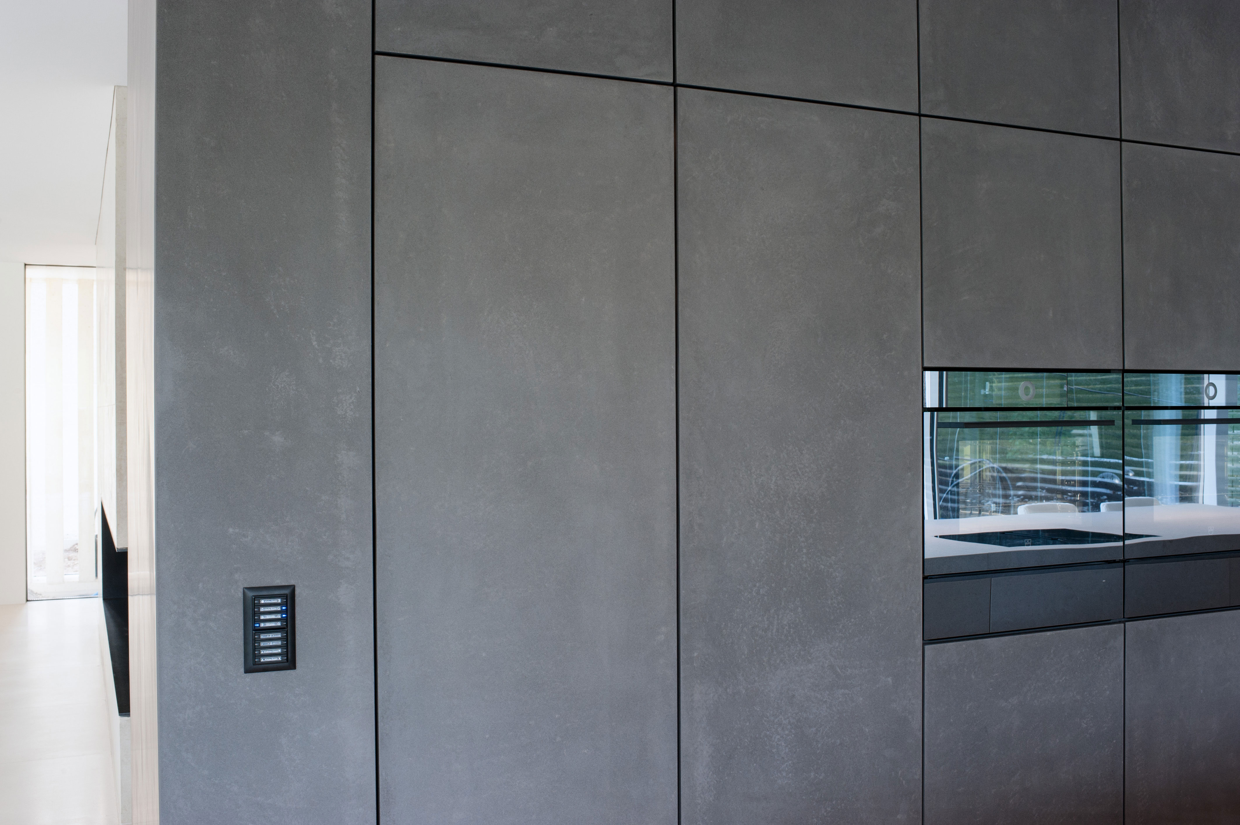 Gesucht war ein exklusiver Belag, der sich sowohl von Optik und Haptik wie auch im Bezug auf die Widerstandsfähigkeit von herkömmlichen Oberflächen abhebt. Zudem soll die Oberfläche mit den übrigen Materialien harmonieren. Bei diesem modernen und geradlinigen Objekt wird grosser Wert auf die Spaltmasse der Schrank- und Schubladenfronten gelegt, die Oberfläche soll glatt und eben wirken.
