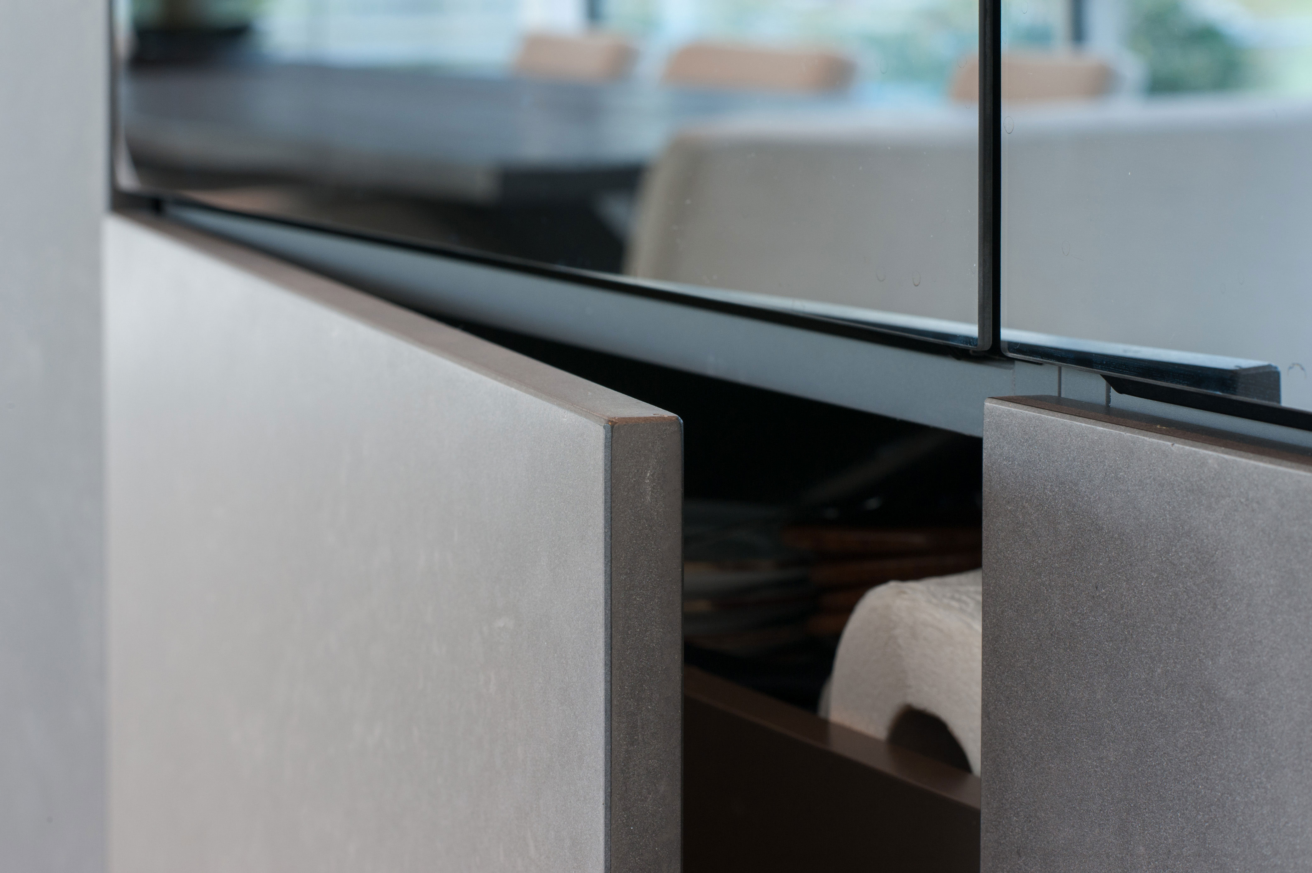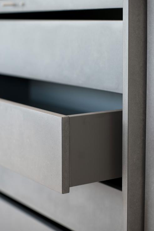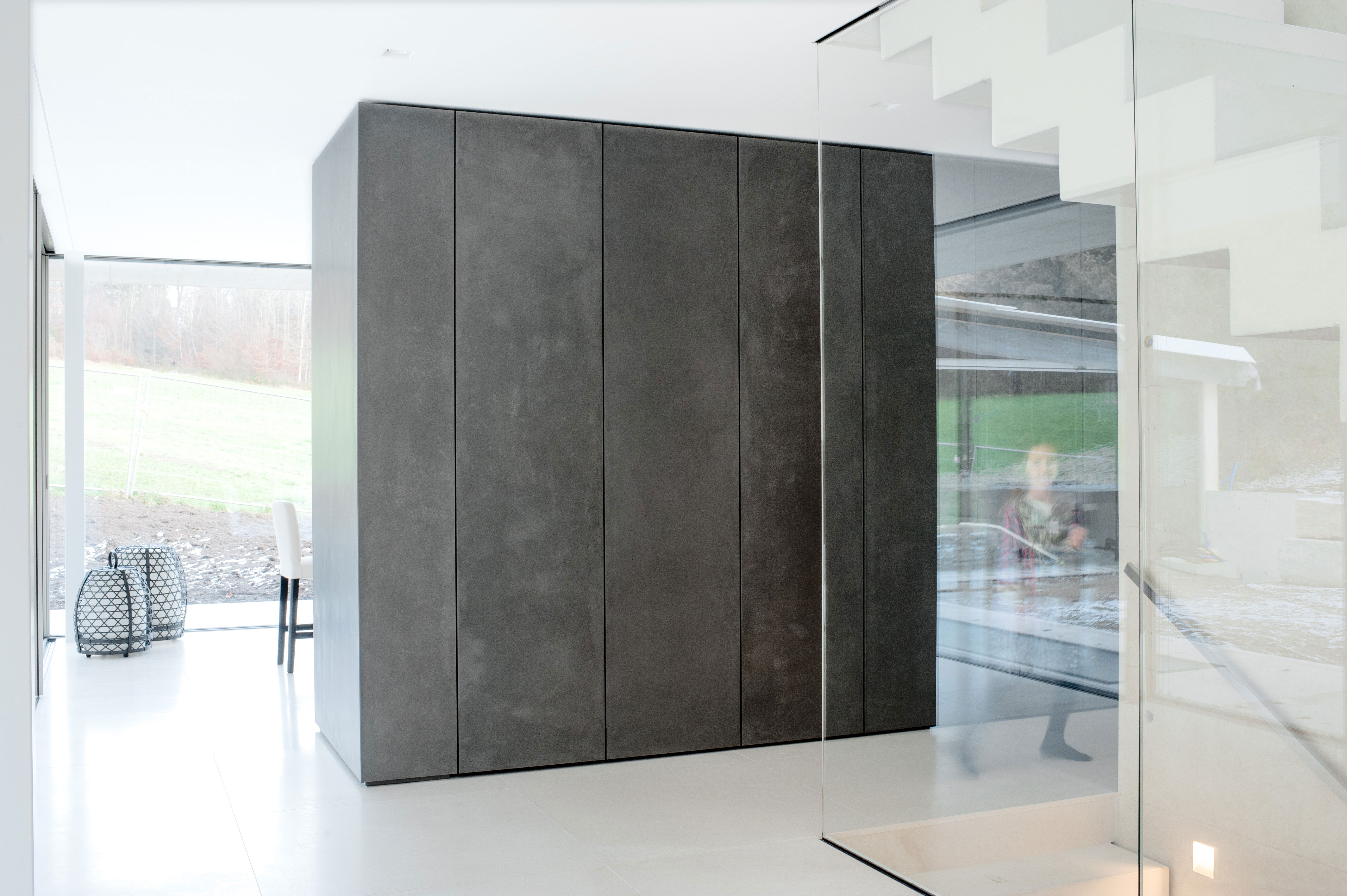 Dank unserer Eigenentwicklung sind wir in der Lage, Schrank- und Schubladenfronten samt Kanten fugenlos und flächenbündig mit Terra di Pietra zu beschichten. Die Ausführung des Kubus erfolgte in enger Zusammenarbeit mit der Schreinerei Käser AG in Walterswil, die genauso viel Wert auf Details und Handwerkskunst legt, wie wir.