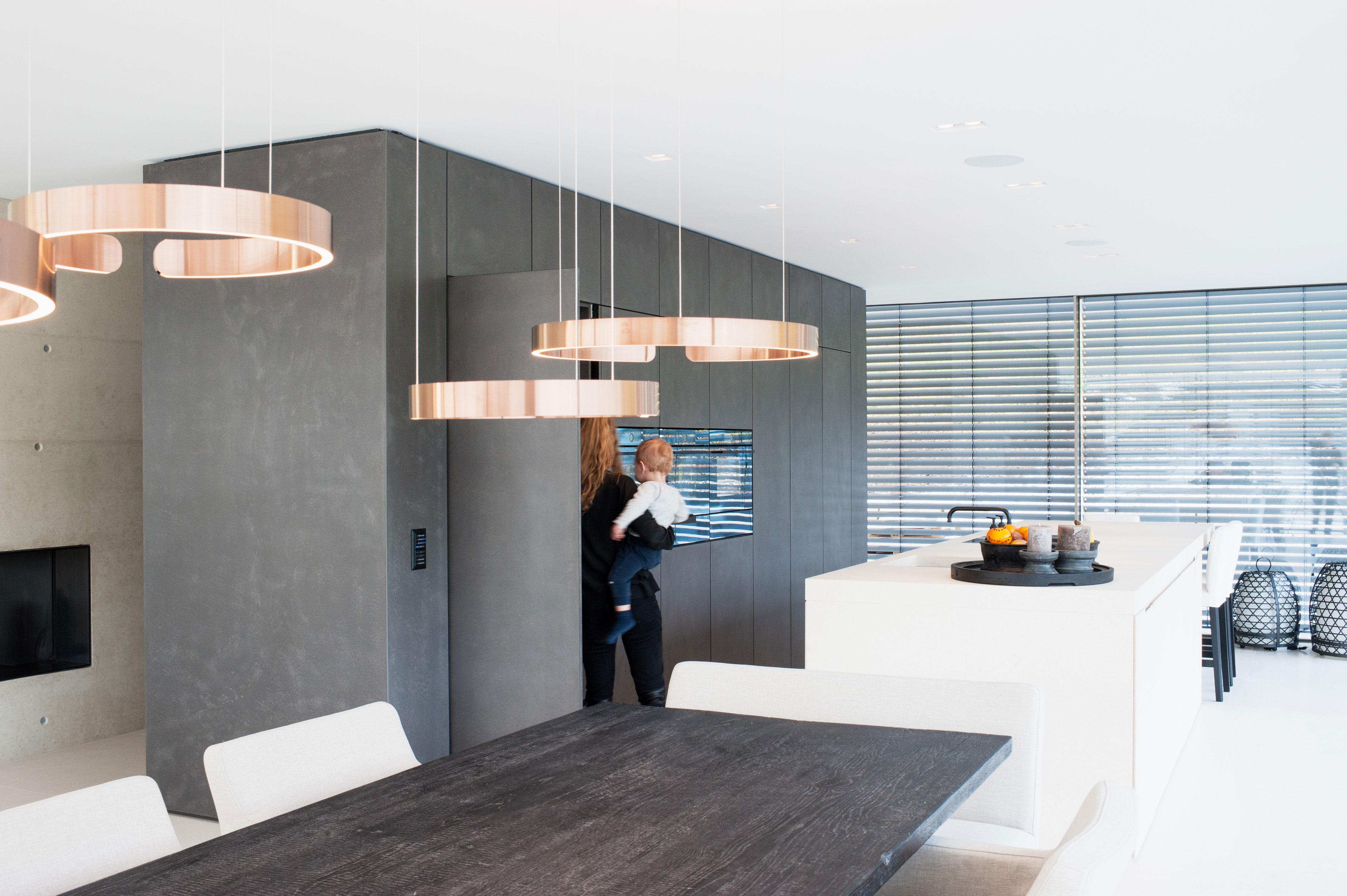 In einem von endres architekten entwickelten Neubau wirkt ein Küchen-Kubus als exklusiver Raumteiler. Der Kubus nimmt die Küchenfront auf und bietet gleichzeitig viel Stauraum.
