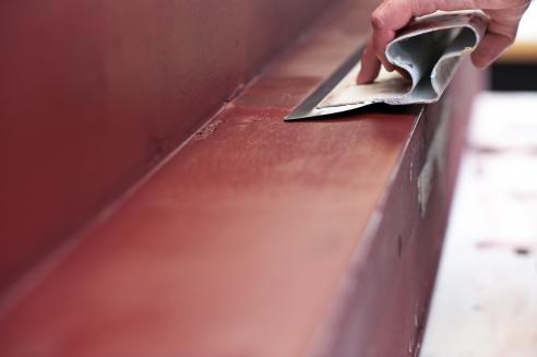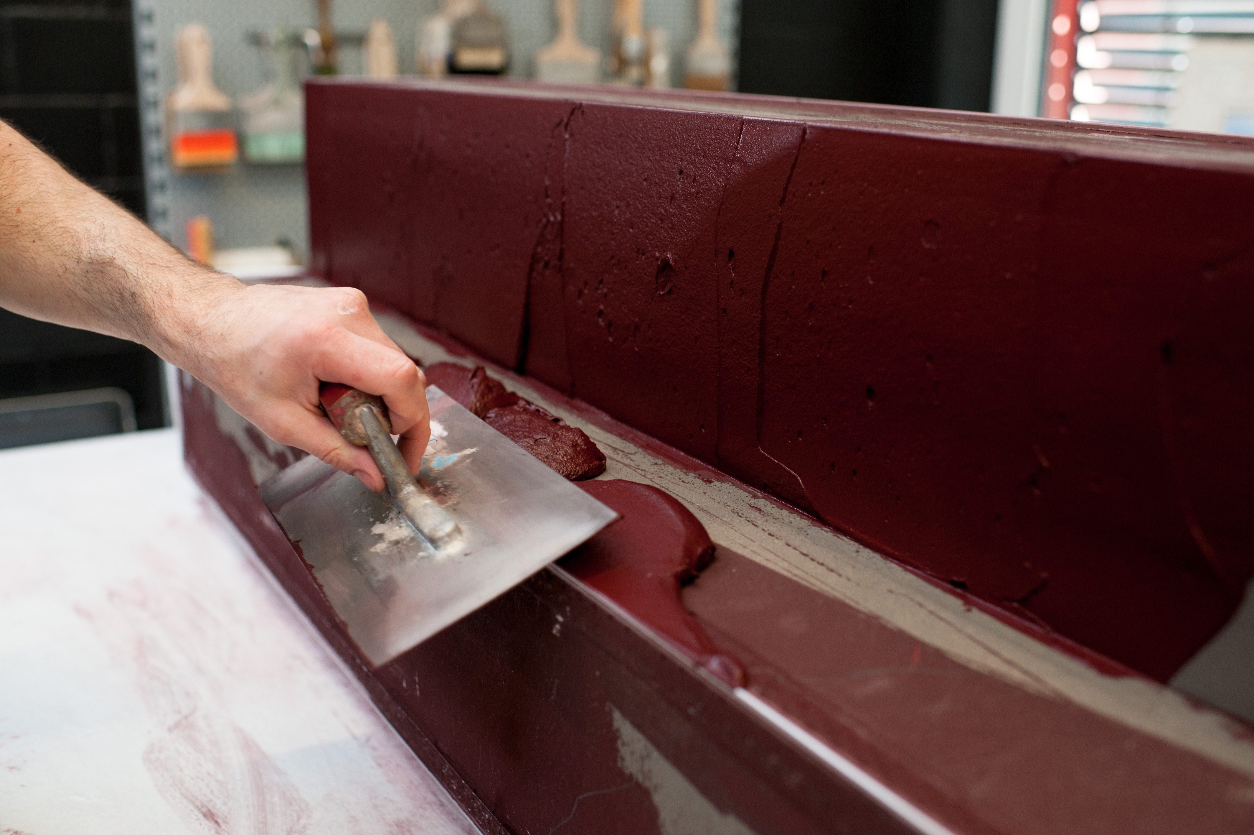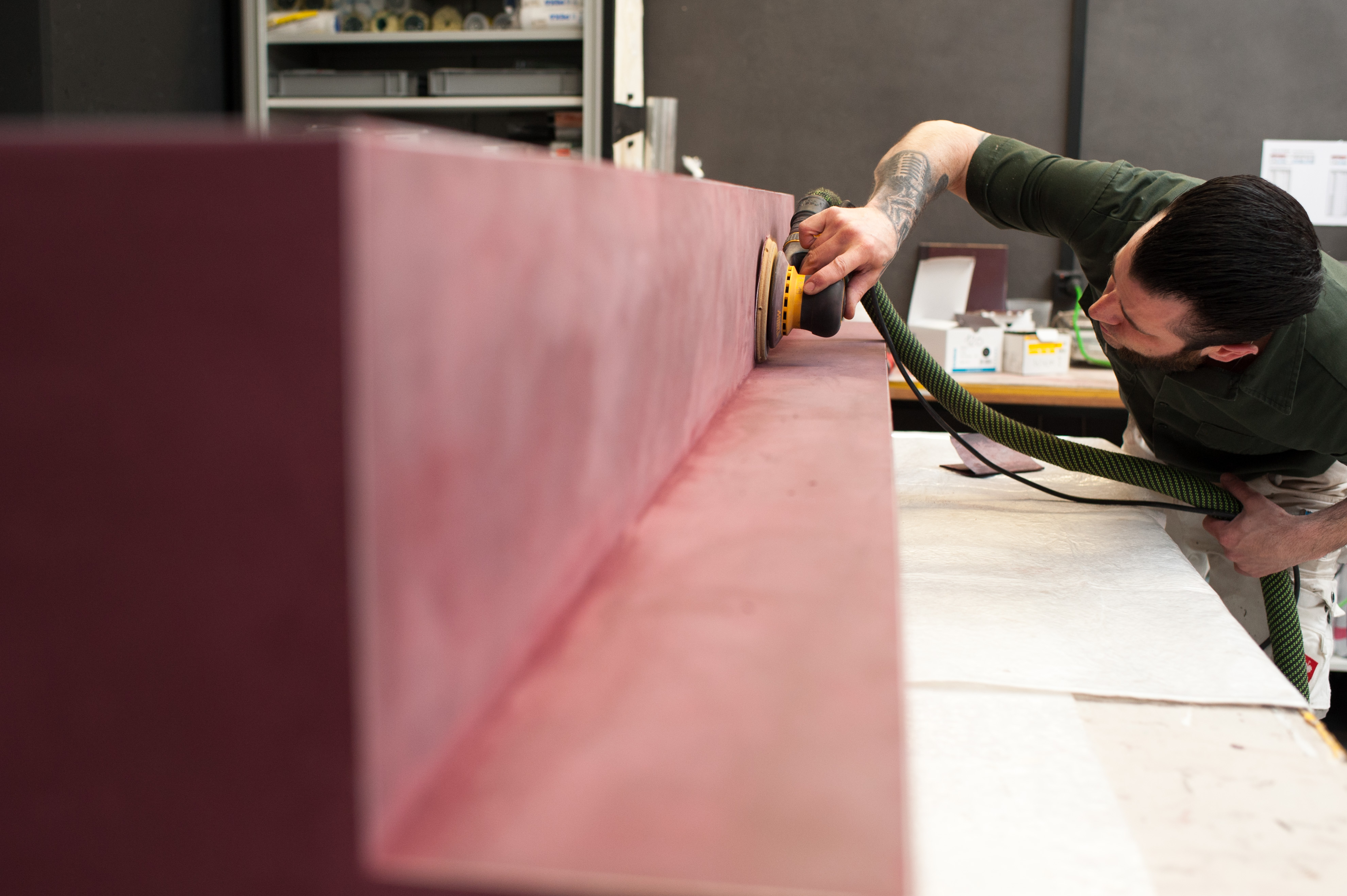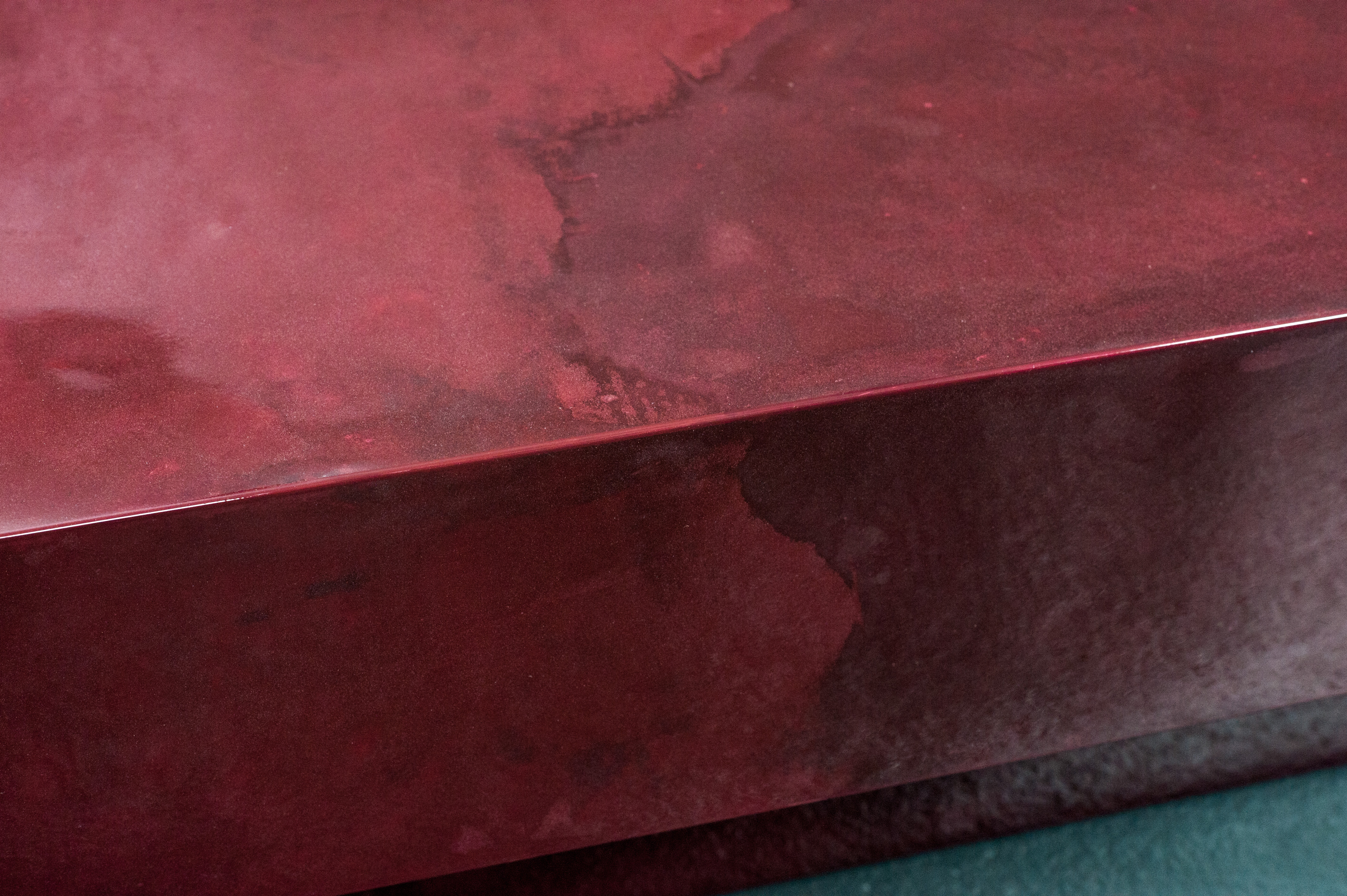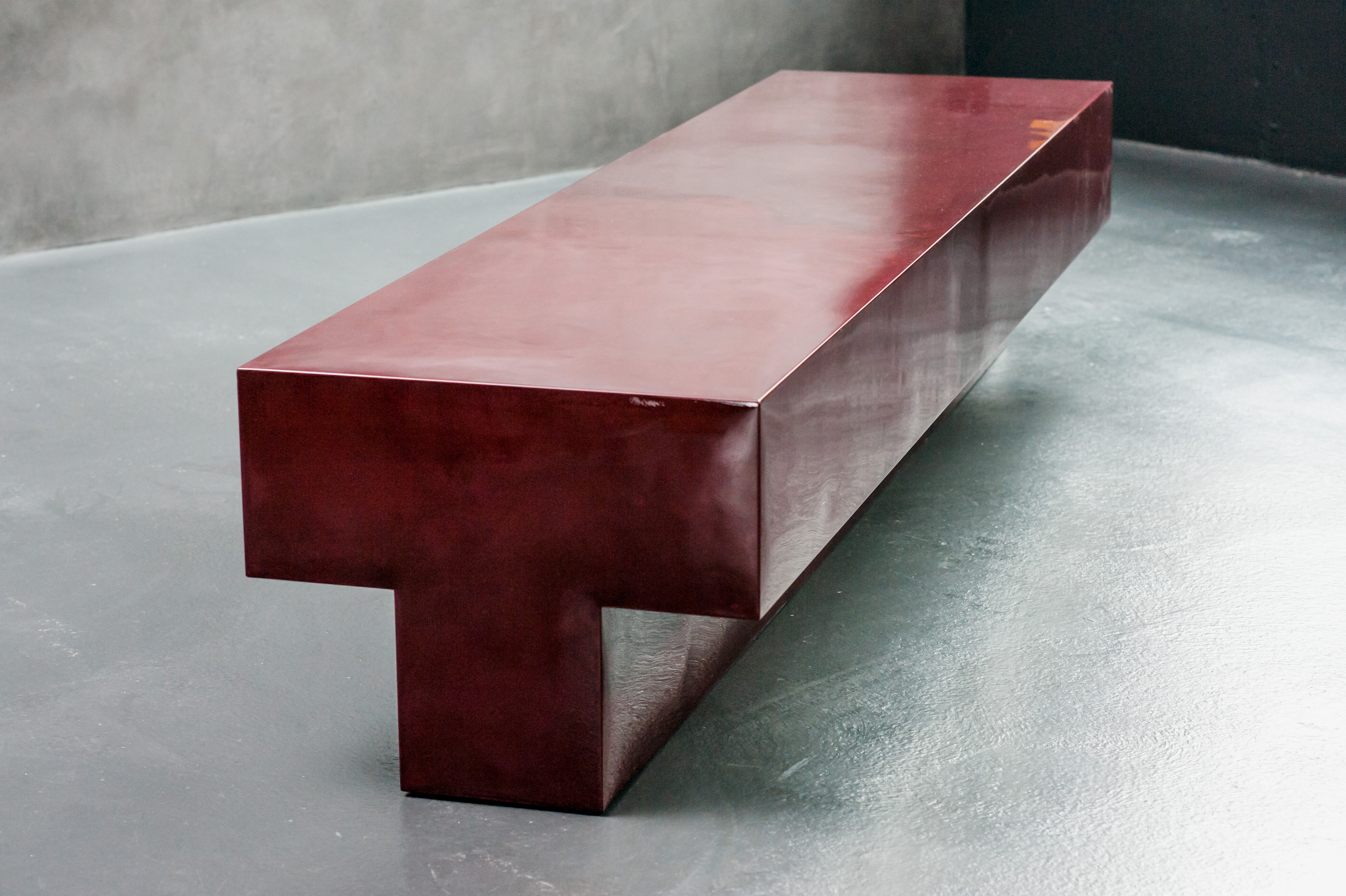 Gewünscht war ein von Hand gefertigtes Lowboard für eine private Lounge. Jacqueline van Maren, projektbegleitende Innenarchitektin, entwarf ein exklusives T-förmiges Element, das sich mit seiner einzigartigen, glänzenden Oberfläche in Bordeauxrot harmonisch in die Lounge einfügt und das Raumkonzept abrundet.